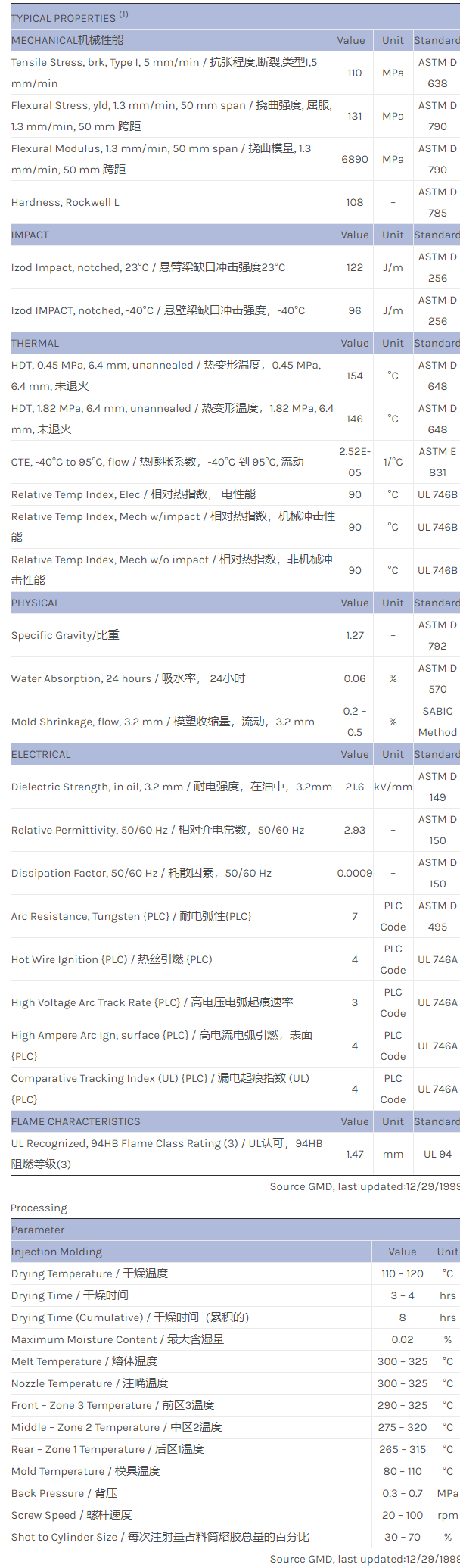 应用范围:产品描述NORYL PPO RFN30物性表GR 30%. NSF approvable. 295F (146C) DTUL. Passes UV 720 hour weatherometer test. Existing applications only. Suggested alternative GFN3.