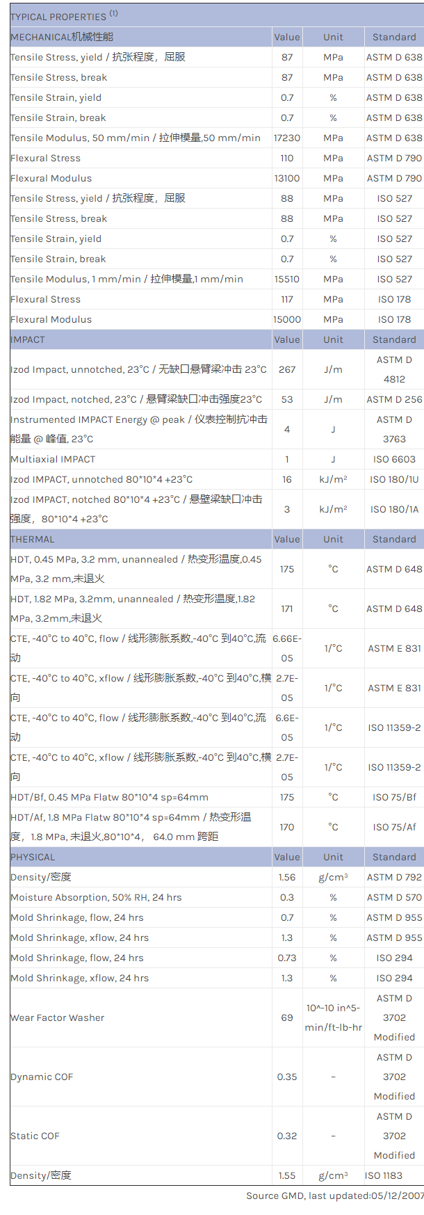 应用范围:产品描述LNP LUBRICOMP KCL34A物性表LNP LUBRICOMP KCL34A是一种聚甲醛(POM)均聚物材料,含有的填充物为碳纤维增强材料。LNP LUBRICOMP KCL34A的主要特性有:传导性润滑