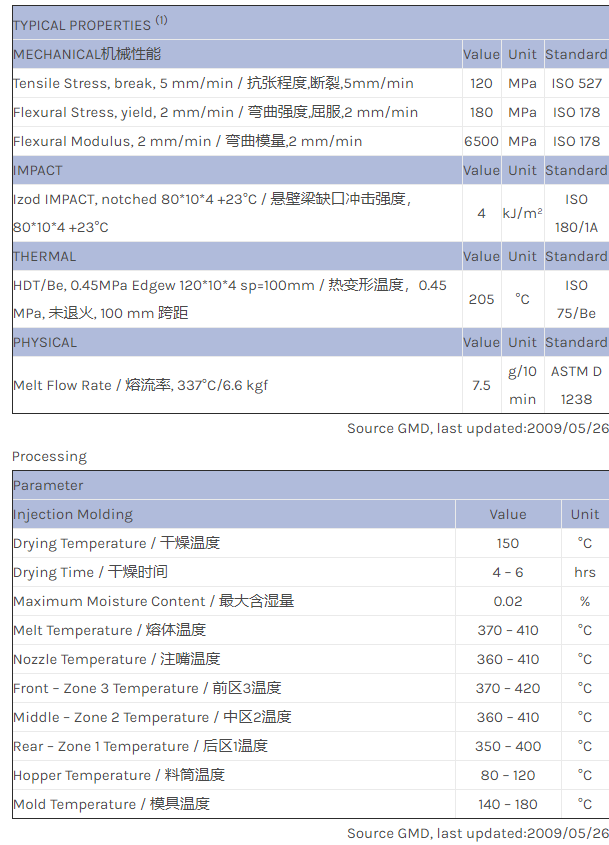 The data listed in this data sheet are the lower specification limits, apart from the MFR which is typical data. The MVR of this material at 337 degrees C/6.7 kgf will have a specification between 3 and 7.5 (MFR: 4.2-10.5)
