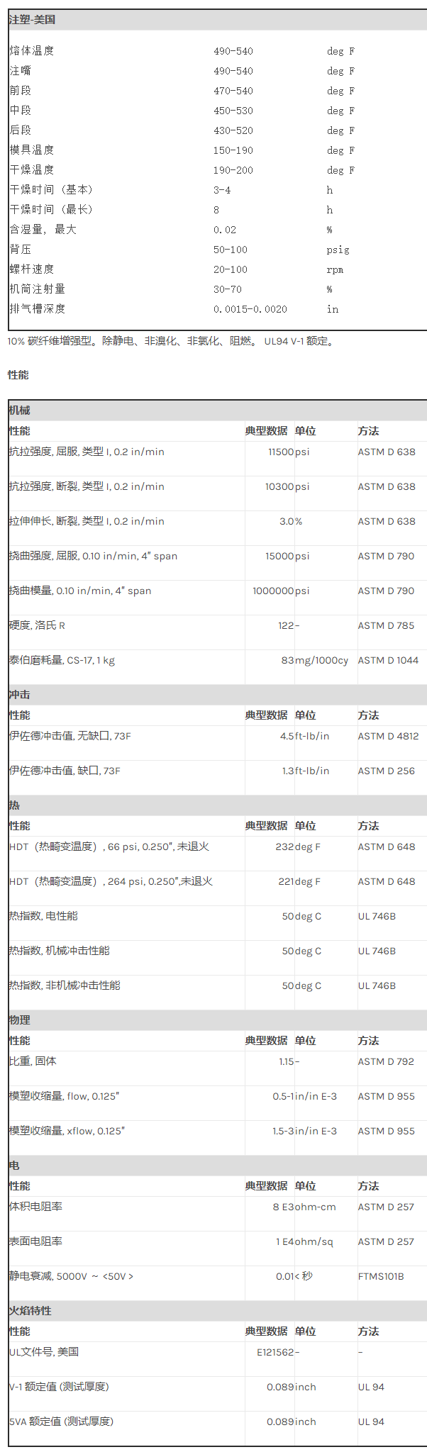 10% 碳纤维增强型。除静电、非溴化、非氯化、阻燃。 UL94 V-1 额定。