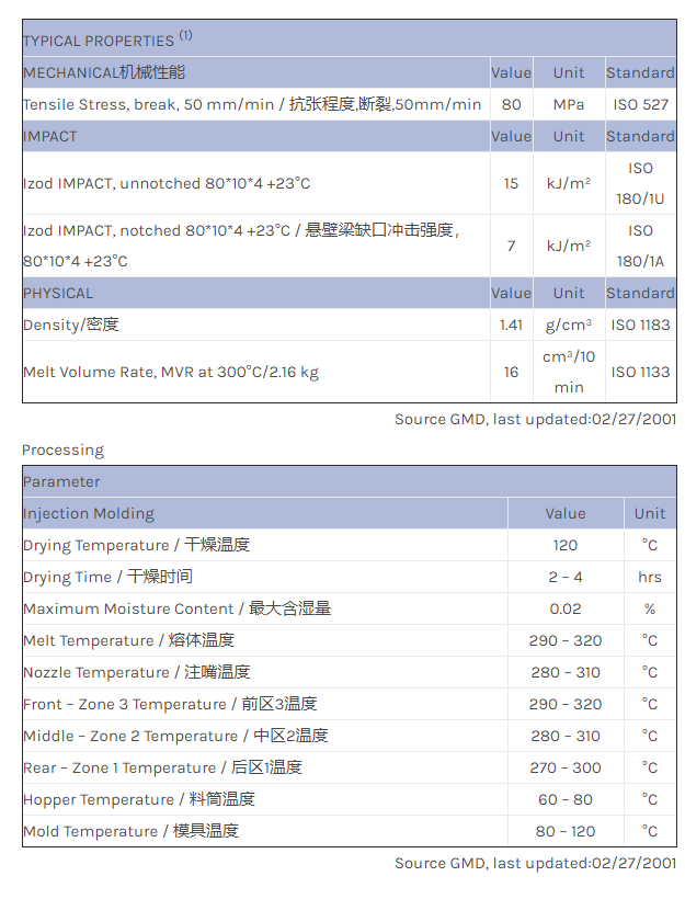 LNP* Lubricomp* Lexan_EXCP0010 compound is a 20% glass reinforced, 10% PTFE filled PC injection moulding resin with excellent wear resistance properties.