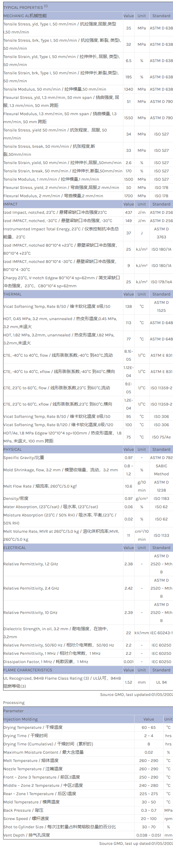 应用范围:产品描述NORYL PPO RF1132物性表PPE+PP blend for high frequency applications. Good heat resistance and low DK.