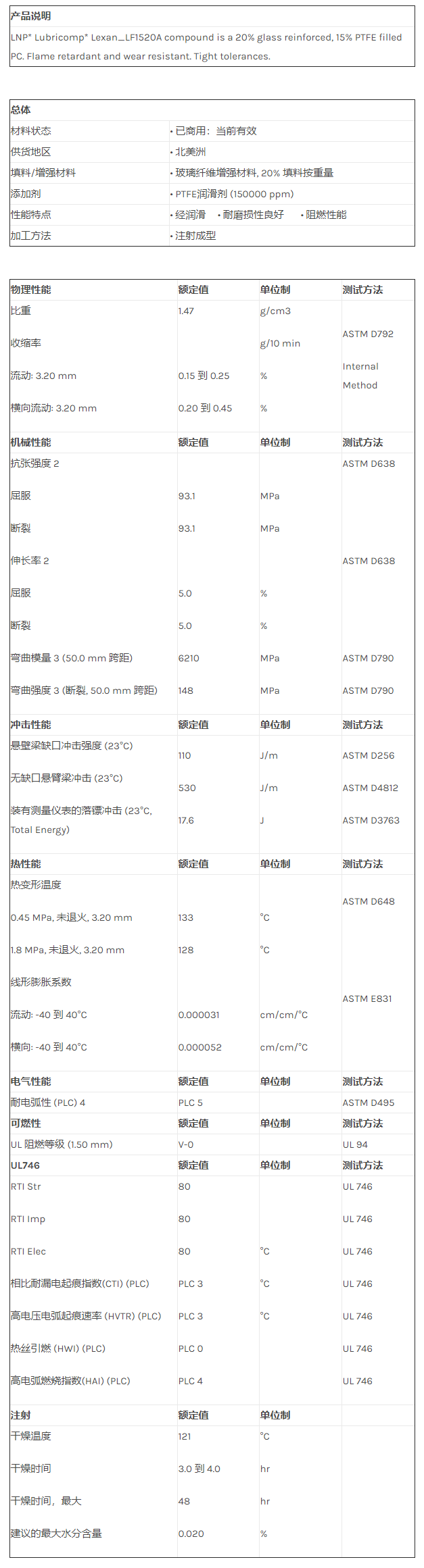 应用范围:产品描述LNP LUBRICOMP LF1520A物性表