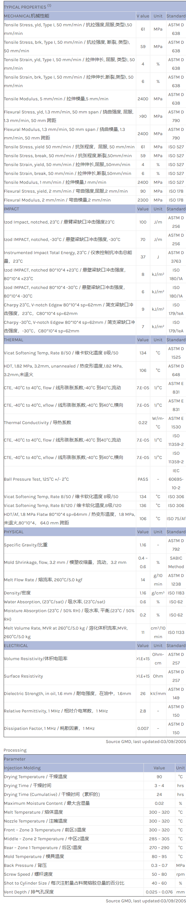 应用范围:产品描述CYCOLOY PC/ABS EXCY0102物性表Modified PC blend offering metallic look with minimal flowline visibility.