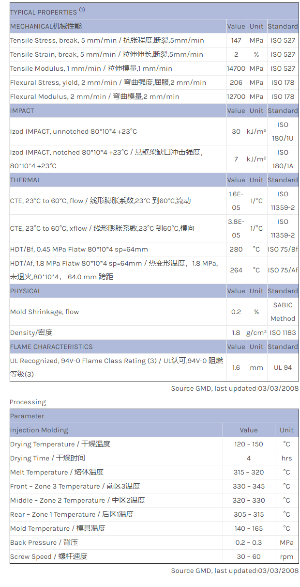 应用范围:产品描述LNP LUBRICOMP OFL38A物性表LNP LUBRICOMP OFL38A是一种支化聚苯硫醚材料,含有的填充物为碳纤维增强材料,加工方式为:注射成型。LNP LUBRICOMP OFL38A的主要特性有:阻燃/额定火焰通过ROHS认证