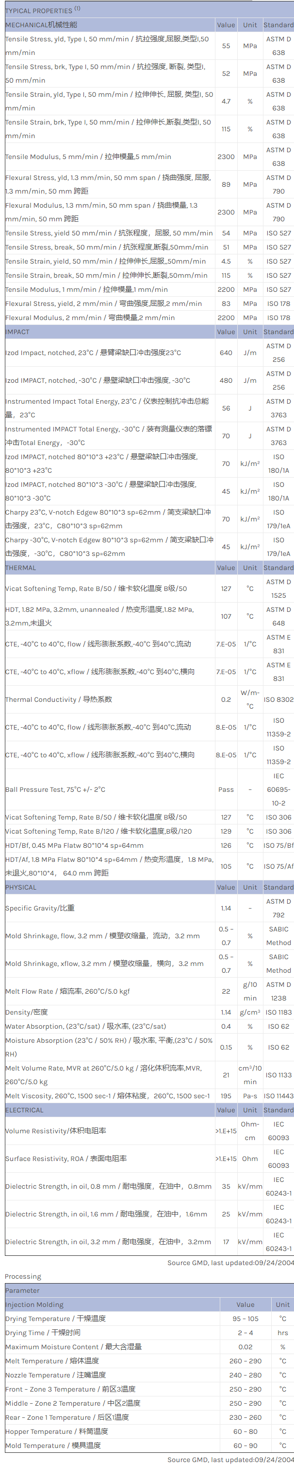 应用范围:产品描述CYCOLOY PC/ABS XCY620物性表Cycoloy XCY620 resin是一种聚碳酸酯+丙烯腈丁二烯苯乙烯(PC+ABS)产品,可以通过注射成型或注射成型进行加工。典型应用领域为:汽车行业。特性包括:高流动性、耐冲击、耐热、柔软、水解稳定性相关色号:XCY620-BK1005、XCY620-100、XCY620-BR8G020、XCY620-WH8D098、XCY620-W