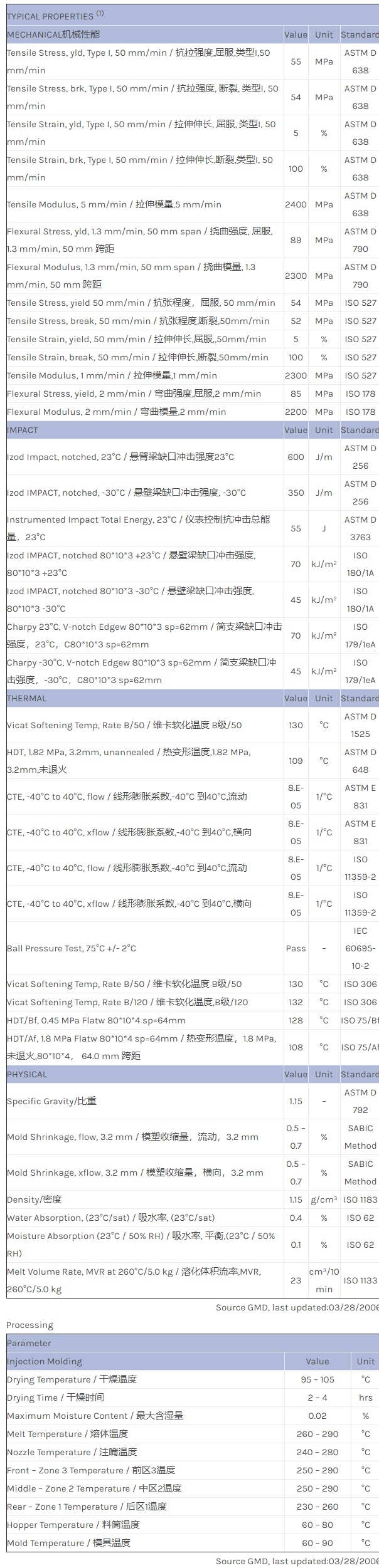 应用范围:产品描述CYCOLOY PC/ABS XCY620H物性表High IMPACT and High Flow PC + ABS. Ductile at low temperature and excelent property retention after heat aging and hydroytic aging相关色号:XCY620H-1111