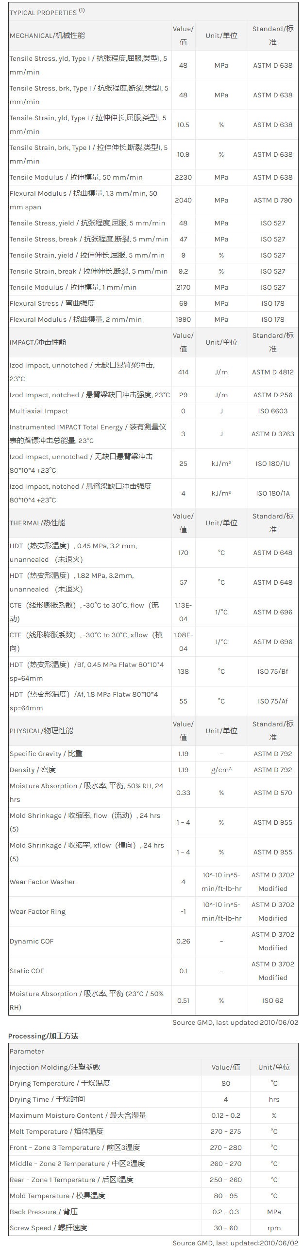 应用范围: 产品描述 LNP Lubricomp QP004物性表 “LNP LUBRICOMP QP004是一种聚酰胺610(尼龙6/10)产品,可以通过注射成型进行加工。 主要特性: 耐磨 润滑” 相关颜色色号:QP004-NC LNP* Lubricomp* QP004 is a compound based on Nylon 6/10 containing PTFE/Silicone