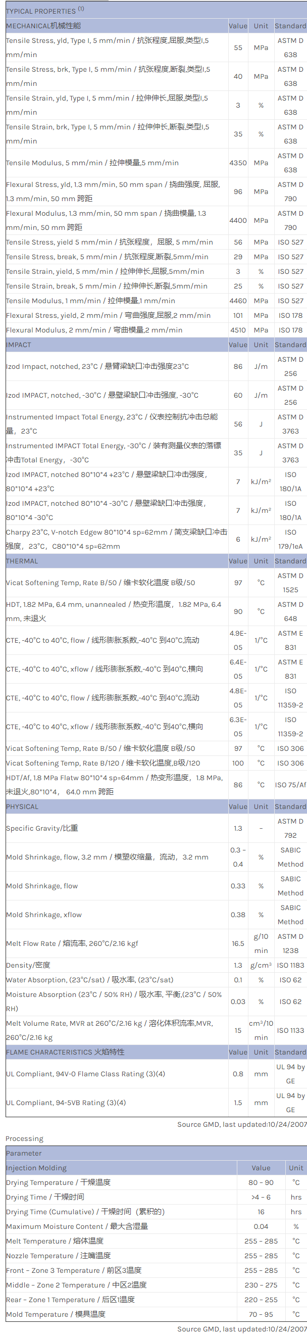 应用范围:产品描述CYCOLOY PC/ABS CM6240物性表Cycoloy CM6240 resin是一种聚碳酸酯+丙烯腈丁二烯苯乙烯(PC+ABS)材料,加工方式为:注射成型。Cycoloy CM6240 resin的主要特性有: 阻燃/额定火焰、无卤素、 Flame Retardant、柔软Cycoloy CM6240 resin的典型应用领域为:工程/工业配件相关色号:CM6240-BK1C34
