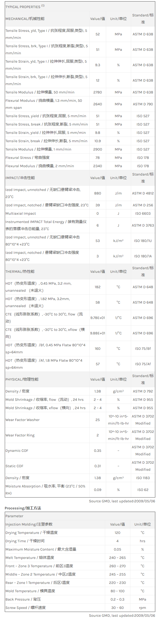 应用范围: 产品描述 LNP Lubricomp WL002物性表 “LNP LUBRICOMP WL002是一种聚丁烯对苯二甲酸酯(PBT)产品,可以通过注射成型进行加工。 特性包括: 耐磨 润滑” LNP* Lubricomp WL002 is a Thermoplastic Polyester (PBT) base resin containing PTFE. Property/特性