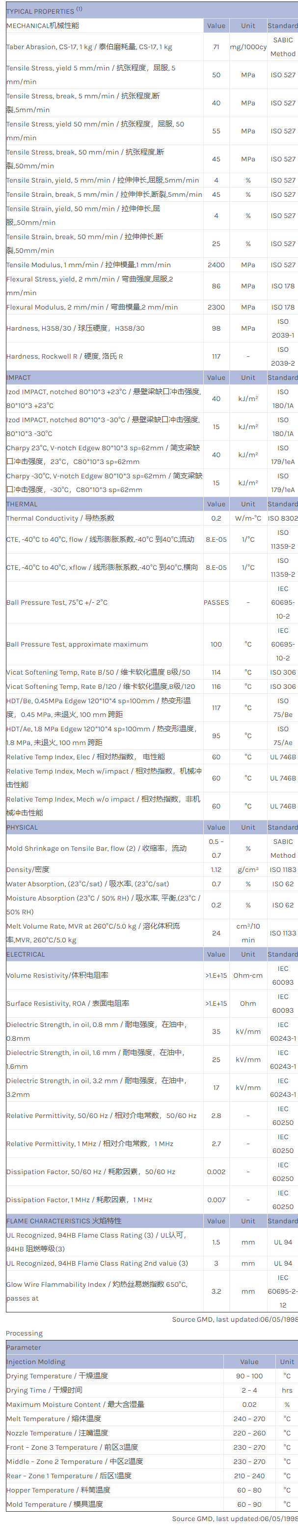 应用范围:产品描述CYCOLOY PC/ABS C1000HF物性表CYCOLOY C1000HF is a general purpose PC+ABS blend specially developed for thin wall applications requiring a high flow with a good balance of properties. It is suitable fo