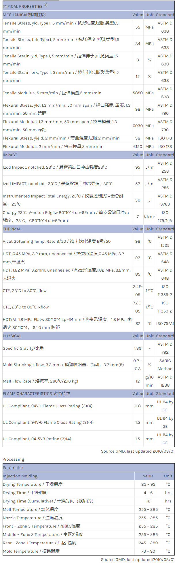 Cycoloy CM6220 resin是一种聚碳酸酯(PC)材料,含有的填充物为矿物填料。 加工方式为:注射成型。