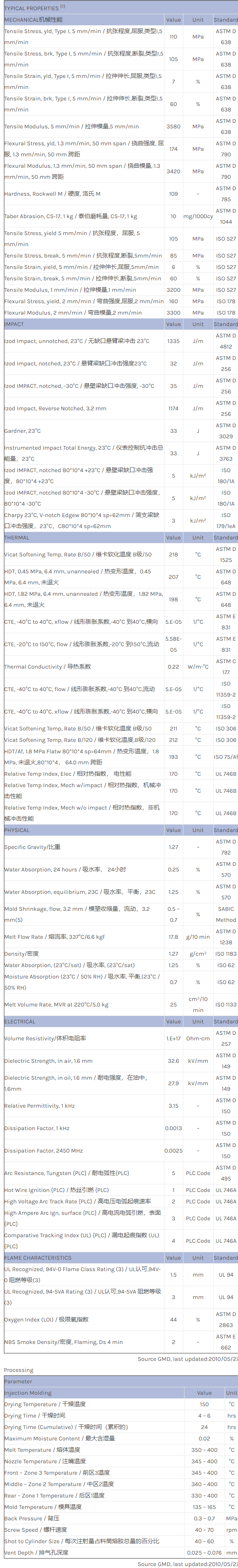 应用范围:产品描述ULTEM PEI 1010TC物性表Ultem 1010TC resin是一种聚酯酰亚胺(PEI)材料,加工方式为:注射成型。典型应用领域包括:食品接触应用水管/管道/饮用水主要特性有:阻燃/额定火焰环保/绿色可接触食品相关色号:1010TC-BR6D063T、1010TC-BR6D062T、1010TC-BR6D205T、1010TC-BR4E125T