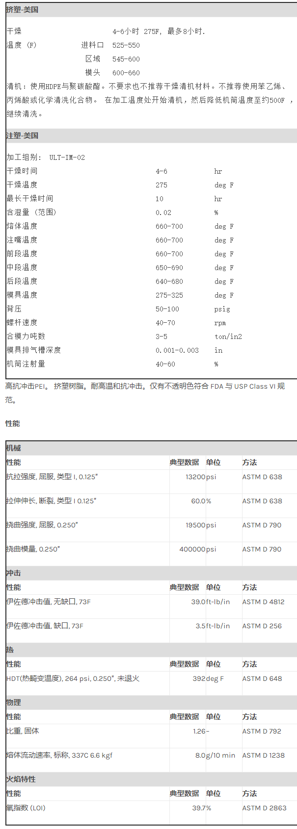 应用范围: 产品描述 Ultem PEI HTX1050F物性表 高抗冲击PEI。 挤塑树脂。耐高温和抗冲击。仅有不透明色符合 FDA 与 USP Class VI 规范。 加工