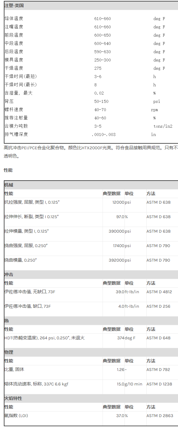应用范围: 产品描述 Ultem PEI HTX2001F物性表 高抗冲击PEI/PCE合金化聚合物。颜色比HTX2000F光亮。符合食品接触用具规范。只有不透明色。 加工