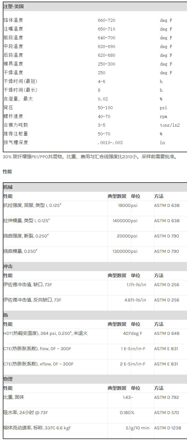 应用范围: 产品描述 Ultem PEI MD133物性表 30% 玻纤增强PEI/PPO共混物。比重、费用与汇合线强度比2310小。采样前需要批准。 加工