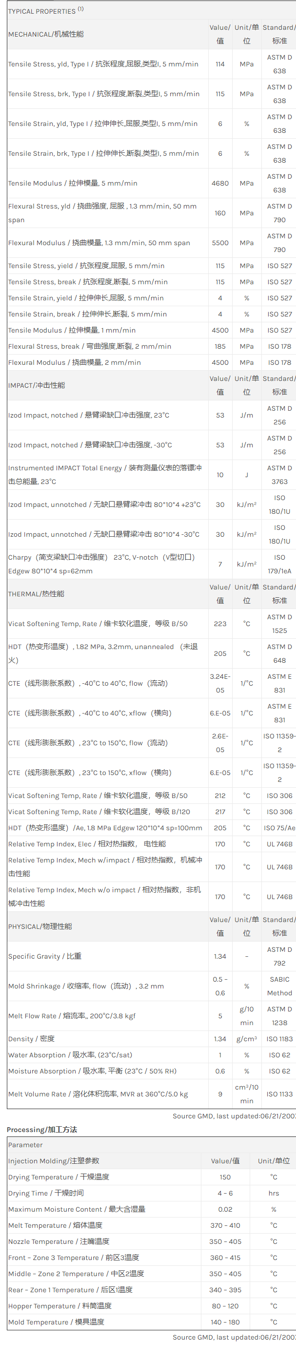 应用范围: 产品描述 ULTEM PEI HU2100物性表 “Ultem HU2100 resin是一种聚酯酰亚胺(PEI)产品,含有的填充物为10%玻璃纤维增强材料,可以通过注射成型进行加工。 应用领域包括医疗/保健和食品接触应用。 特性包括: 可接触食品 生物相容” 10% Glass fiber filled, standard flow Polyetherimide (Tg 217