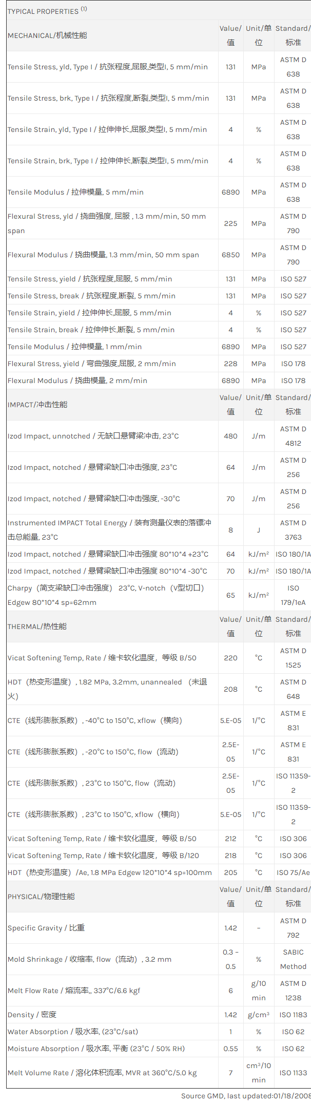 “Ultem HU2200 resin是一种聚酯酰亚胺(PEI)产品,含有的填充物为20%玻璃纤维增强材料。可以通过注射成型进行加工。