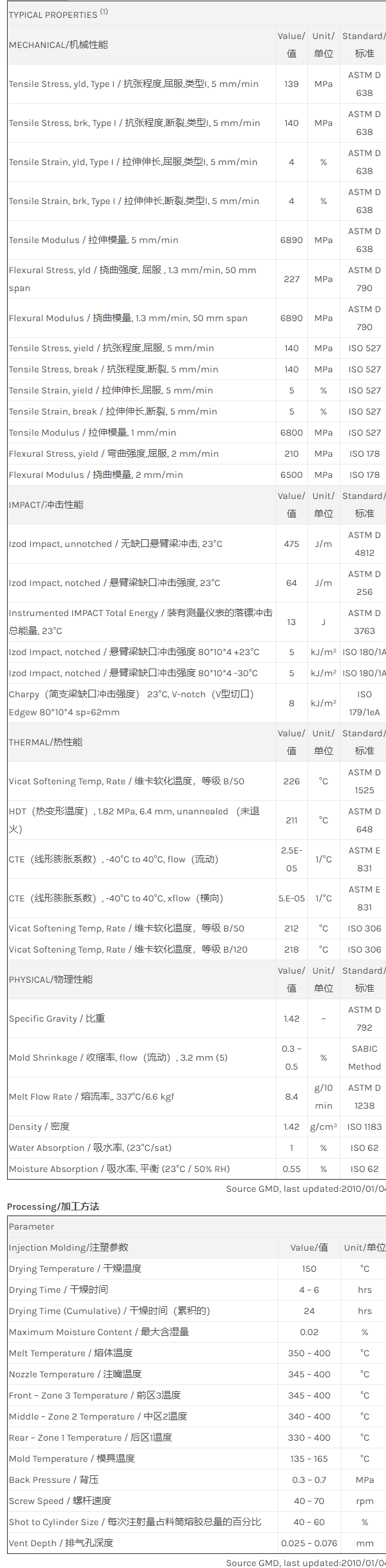 “Ultem HU2210 resin是一种聚酯酰亚胺(PEI)产品,含有的填充物为20%玻璃纤维增强材料。可以通过注射成型进行加工。