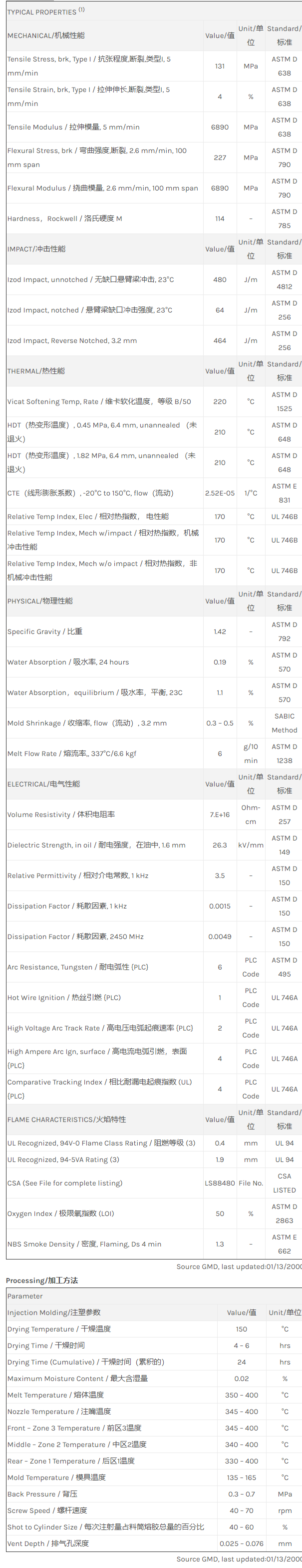 应用范围: 产品描述 ULTEM PEI 2200物性表 20% 玻纤增强,良好的刚度与尺寸稳定性。优异的可加工性。 相关颜色色号:2200-YW9119、2200-1000、2200-7301 20% Glass fiber filled, standard flow Polyetherimide (Tg 217C). ECO Conforming, UL94 V0 and 5VA listin