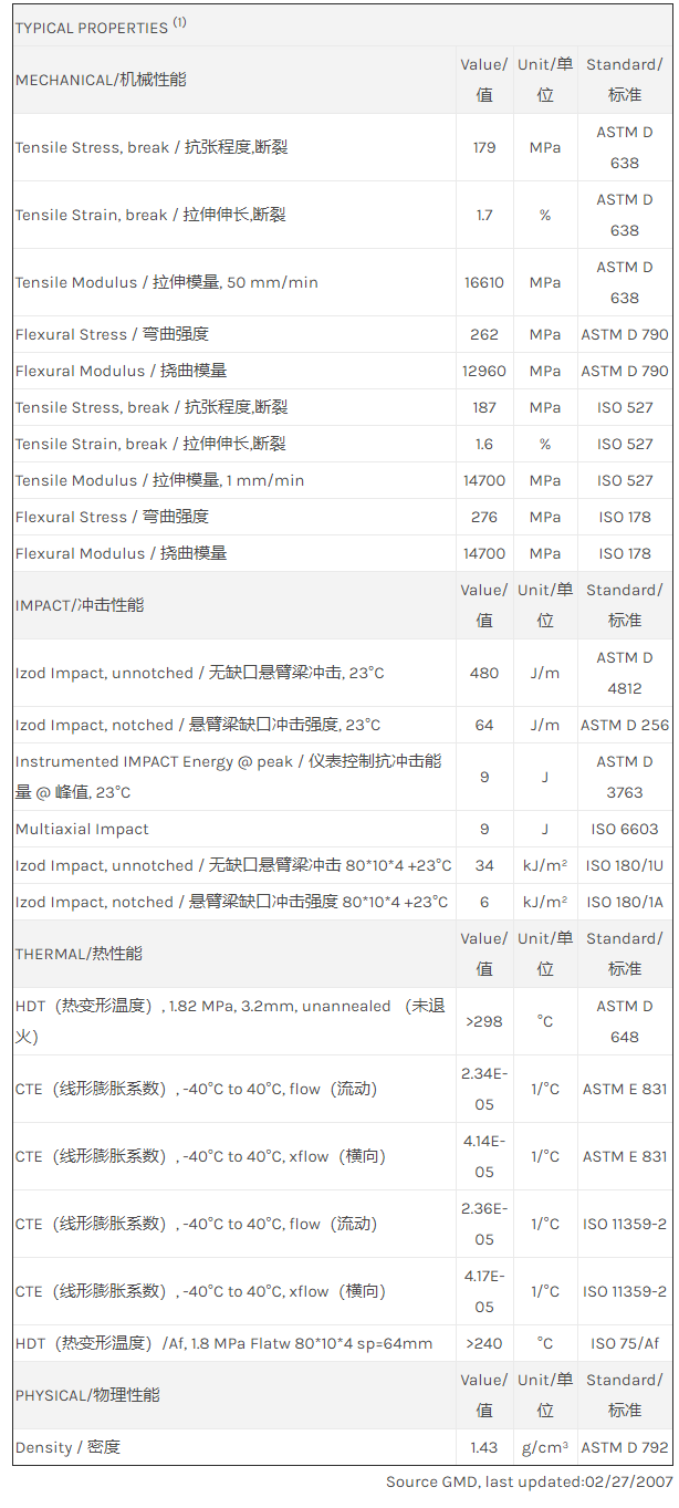 应用范围: 产品描述 LNP Lubricomp LCL33物性表 “LNP LUBRICOMP LCL33是一种聚醚醚酮(PEEK)产品,含有的填充物为15%碳纤维增强材料,可以通过注射成型进行加工。 特性包括: 耐磨 润滑” LNP* Lubricomp* LCL33 is a compound based on Polyetheretherketone resin containing