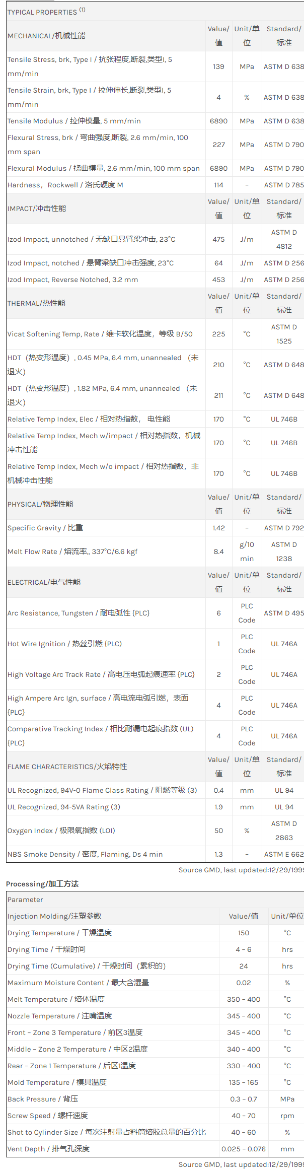 应用范围: 产品描述 ULTEM PEI 2210物性表 20% 玻纤增强、低粘度PEI 树脂。 相关颜色色号:2210-7301、2210-1000、2210-GY6146 20% Glass fiber filled, enhanced flow Polyetherimide (Tg 217C). ECO Conforming, UL94 V0 and 5VA listing. Proper