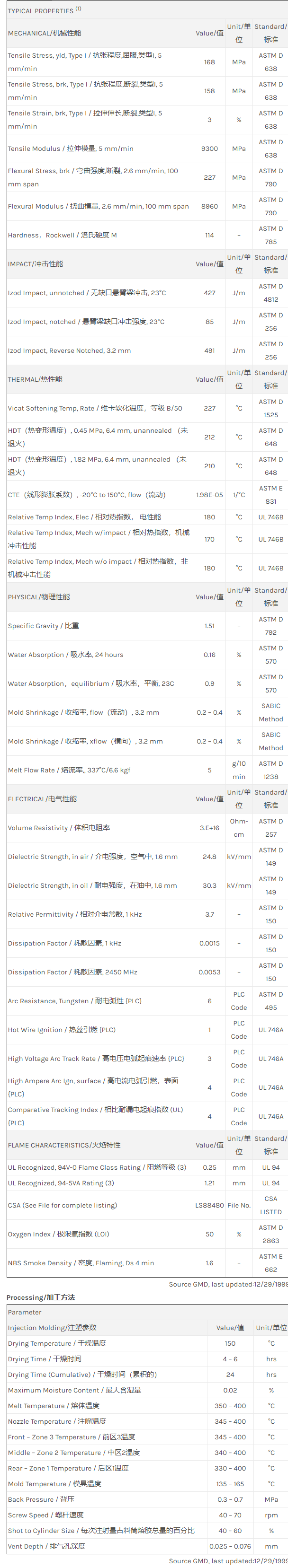 30% Glass fiber filled, standard flow Polyetherimide (Tg 217C). ECO Conforming, UL94 V0 and 5VA listing. NSF 51 listing, WRAS certification, KTW certification in recognized colors.