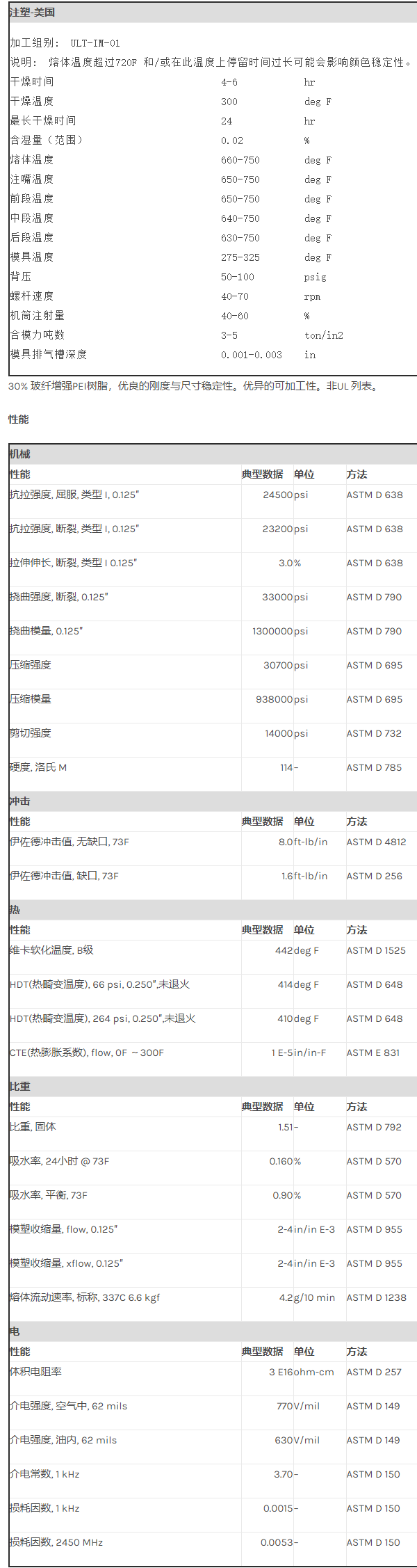 应用范围: 产品描述 Ultem PEI 2300N物性表 30% 玻纤增强PEI树脂,优良的刚度与尺寸稳定性。优异的可加工性。非UL 列表。 加工