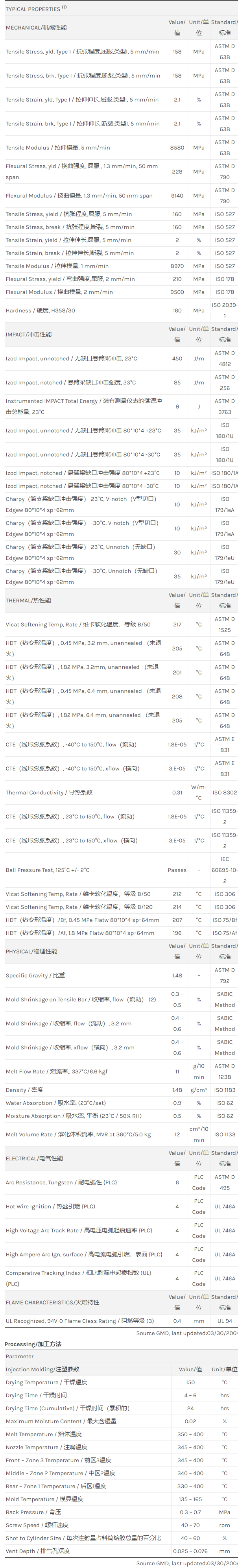 应用范围: 产品描述 ULTEM PEI 2310EPR物性表 “Ultem 2310EPR resin是一种聚酯酰亚胺(PEI)产品,含有的填充物为30% 玻璃纤维增强材料,可以通过注射成型进行加工。 特性包括: 阻燃/额定火焰 环保/绿色 脱模剂” 30% Glass fiber filled, high flow Polyetherimide (Tg 217C) with intern