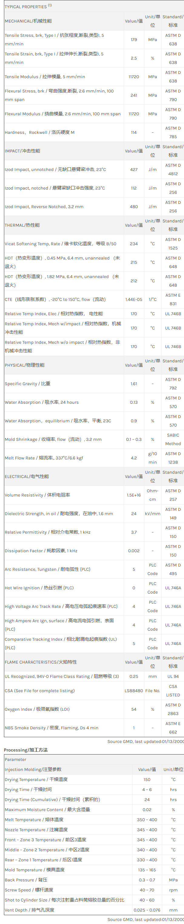 ULTEM 1000的40% 玻纤增强PEI树脂种类。非常高的劲度与尺寸稳定性。