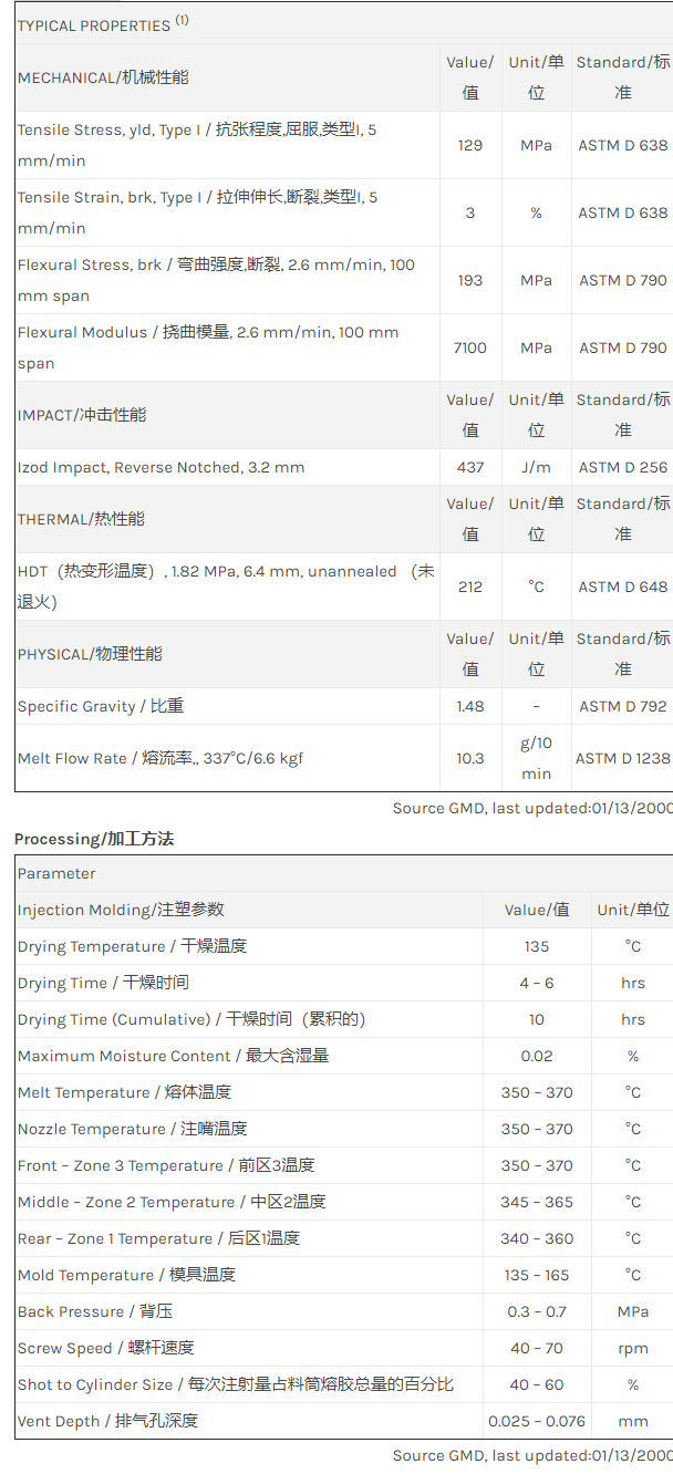 应用范围: 产品描述 ULTEM PEI 4211物性表 20% 玻纤增强、8% PTFE填充PEI。 20% Glass fiber filled and PTFE filled, standard flow Polyetherimide (Tg 217C). ECO Conforming. Property/特性