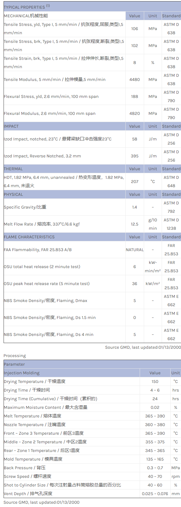 应用范围:产品描述ULTEM PEI AR9110物性表10% Glass fiber filled, enhanced flow Polyetherimide (Tg 217C). Meets FAR 25.853 and OSU 65/65 with low toxicity, smoke, and flame evolution. ECO Conforming.