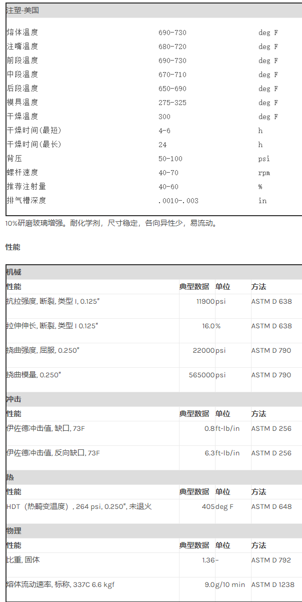 10%研磨玻璃增强。耐化学剂,尺寸稳定,各向异性少,易流动。