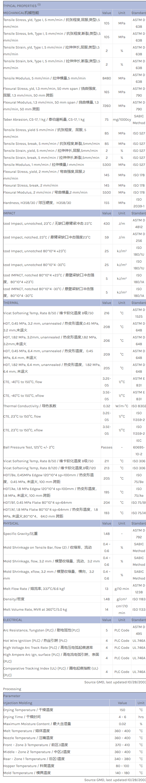 应用范围:产品描述ULTEM PEI EXUM0025物性表30% Milled glass filled, high flow Polyetherimide (Tg 217C) with internal mold release and enhanced electroplatability. ECO Conforming, UL94 V0 listing.
