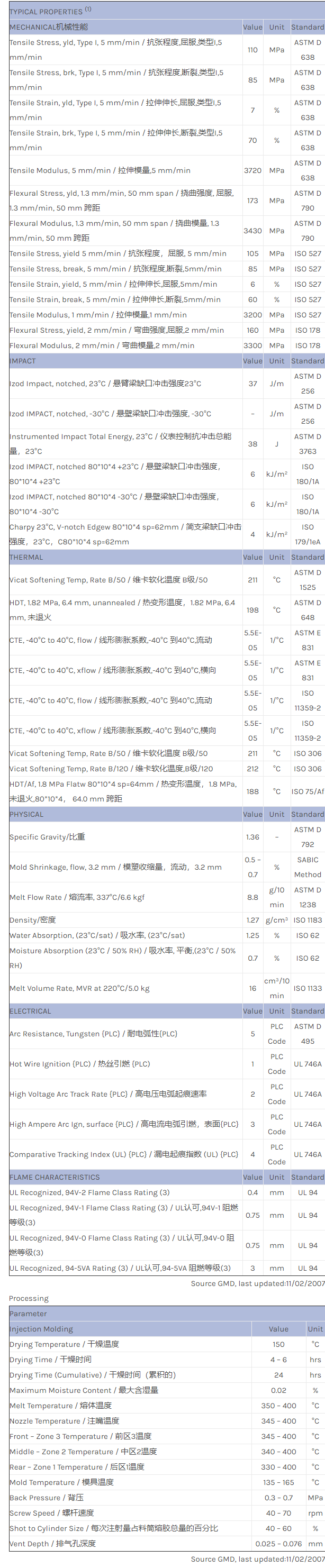 应用范围:产品描述ULTEM PEI 1100V物性表Transparent, standard flow Polyetherimide (Tg 217C). ECO Conforming, UL94 VO and 5VA listing; color dependant, see UL Yellow Card.