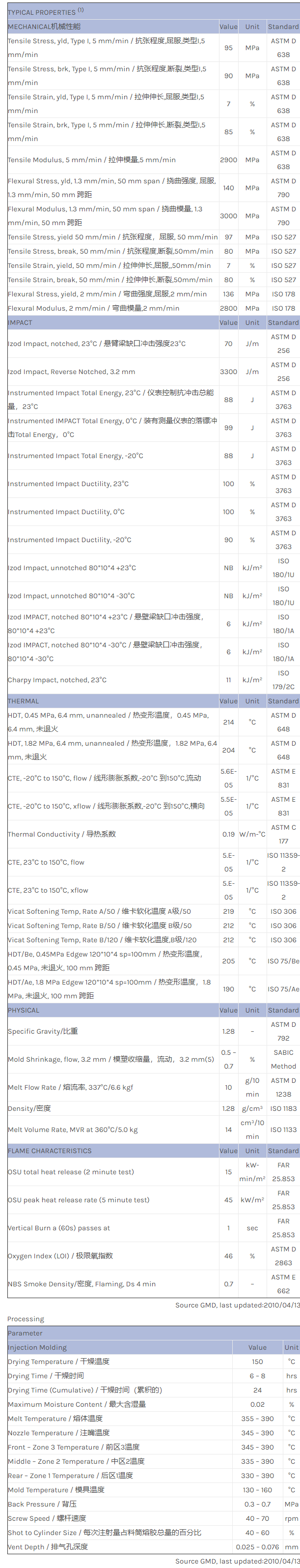 应用范围:产品描述ULTEM PEI 9090物性表Polyetherimide Blend with improved Ductility and Detergent resistance. Meets FAR 25.853 and OSU 55/55 heat release and provides low toxicity, smoke and flame evolution.