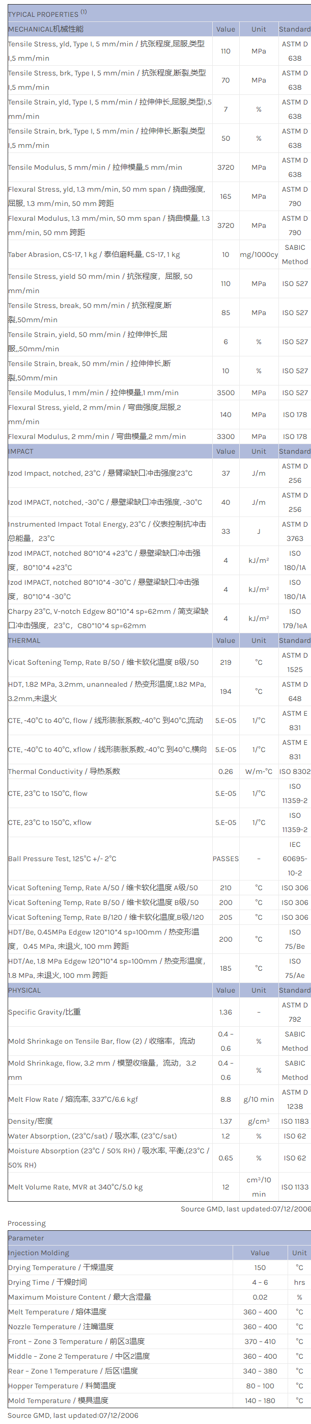应用范围:产品描述ULTEM PEI UR1100B物性表Standard flow, flame retarded Polyetherimide (Tg 217C). Restricted sales to GE Specialty Film & Sheet.