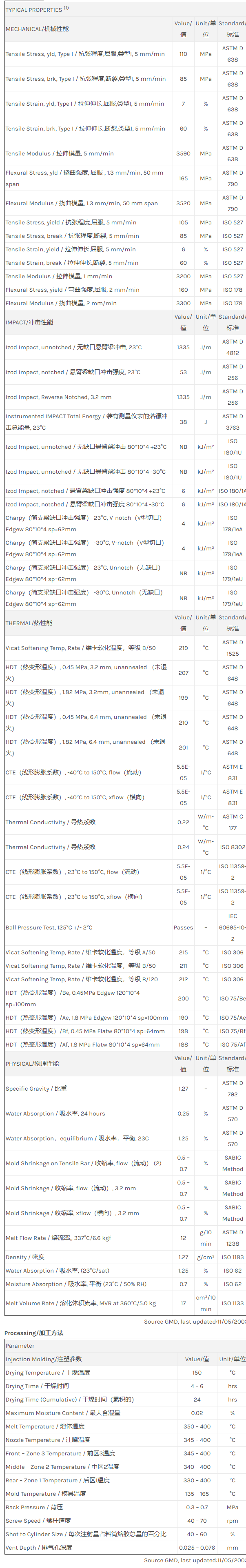 应用范围: 产品描述 ULTEM PEI 1000EF物性表 “Ultem 1000EF resin是一种聚酯酰亚胺(PEI)产品,可以通过注射成型进行加工。 典型应用领域为:食品接触应用。 特性包括: 环保/绿色 可接触食品 脱模剂” Transparent, enhanced flow Polyetherimide (Tg 217C) with internal mold releas