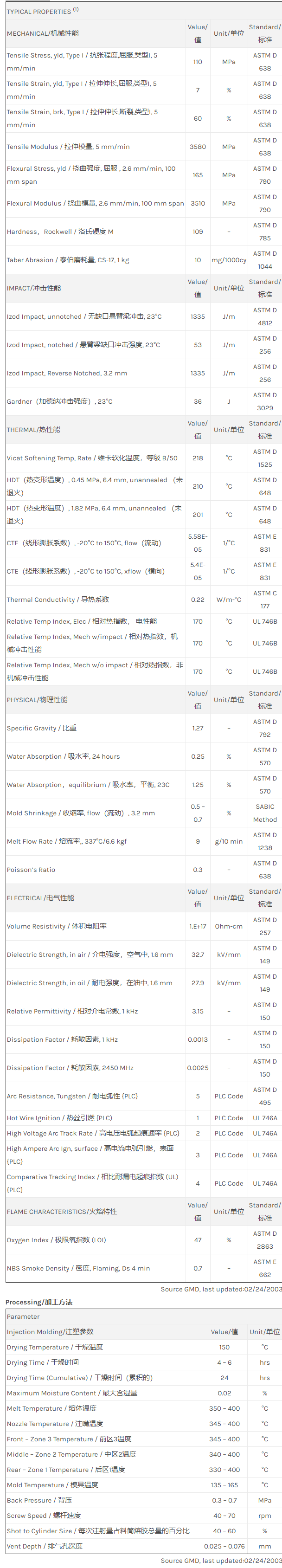未增强型。DTUL(载荷下挠曲温度):392F (200C)。符合 FDA 与USP Class VI 规范。