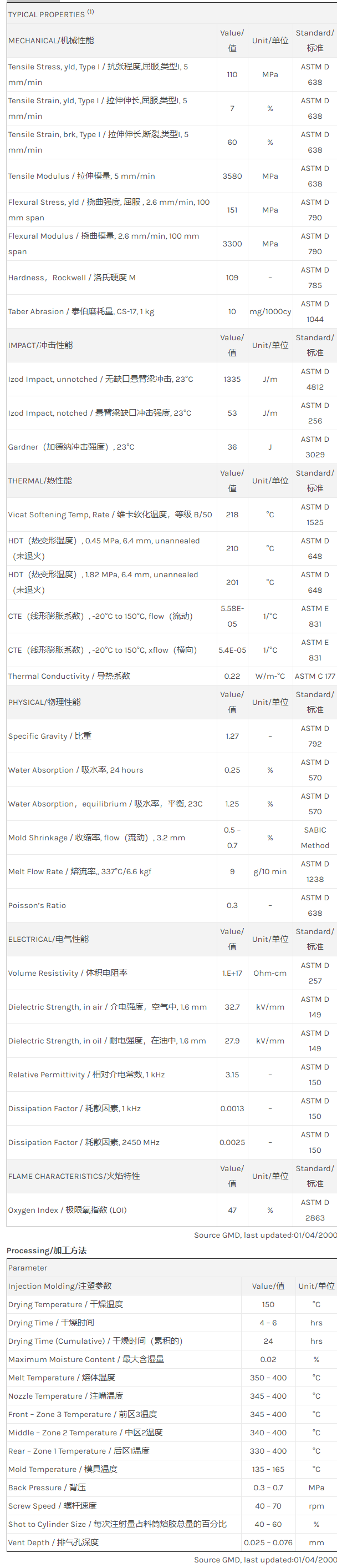应用范围: 产品描述 ULTEM PEI 1000P物性表 未增强型。DTUL(载荷下挠曲温度):392F (200C)。粉末—粗研磨。UL94 V-0/5-V额定。 相关颜色色号:1000P-1000 Standard/标准 flow Polyetherimide (Tg 217C) in 350 micron powder. ECO Conforming. Property/特性