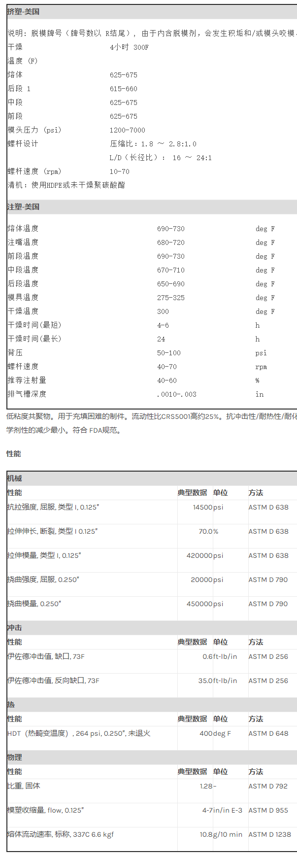 应用范围: 产品描述 Ultem PEI CRS5011F物性表 低粘度共聚物。用于充填困难的制件。流动性比CRS5001高约25%。抗冲击性/耐热性/耐化学剂性的减少最小。符合 FDA规范。 加工