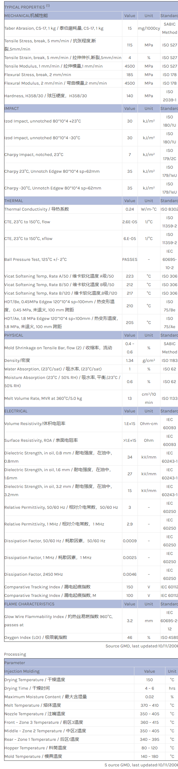10% Glass fiber filled, enhanced flow Polyetherimide (Tg 217C). US FDA and European Food Contact approved. Effective June, 2007 this grade will no longer be supported with biocompatibility information and should not be used for medical applications which require biocompatibility. Alternative grade HU2110.