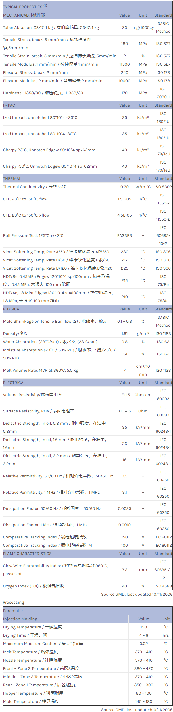 应用范围:产品描述ULTEM PEI 2410F物性表40% Glass fiber filled, enhanced flow Polyetherimide (Tg 217C). UL94 V0 and 5VA listing. US FDA and European Food contact approved. Effective June, 2007 this grade will no longer