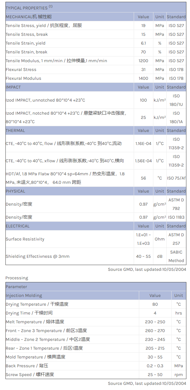 应用范围:产品描述LNP FARADEX MS002物性表LNP* Faradex* MS002 is a compound based on Polypropylene resin containing Stainless Steel. Added features of this material include: Electrically Conductive, EMI/RFI Shielding.