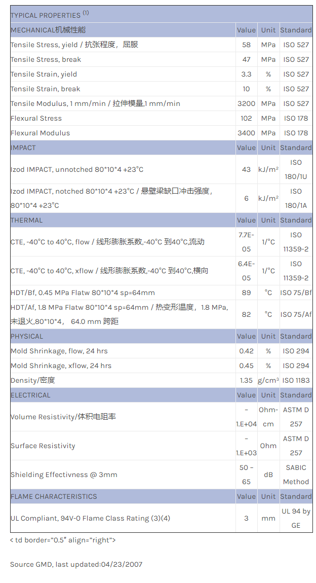 应用范围:产品描述LNP FARADEX NS0039物性表LNP* Faradex* NS0039 is a compound based on PC/ABS resin containing Flame Retardant, Stainless Steel. Added features of this material include: Electrically Conductive, EMI/RFI