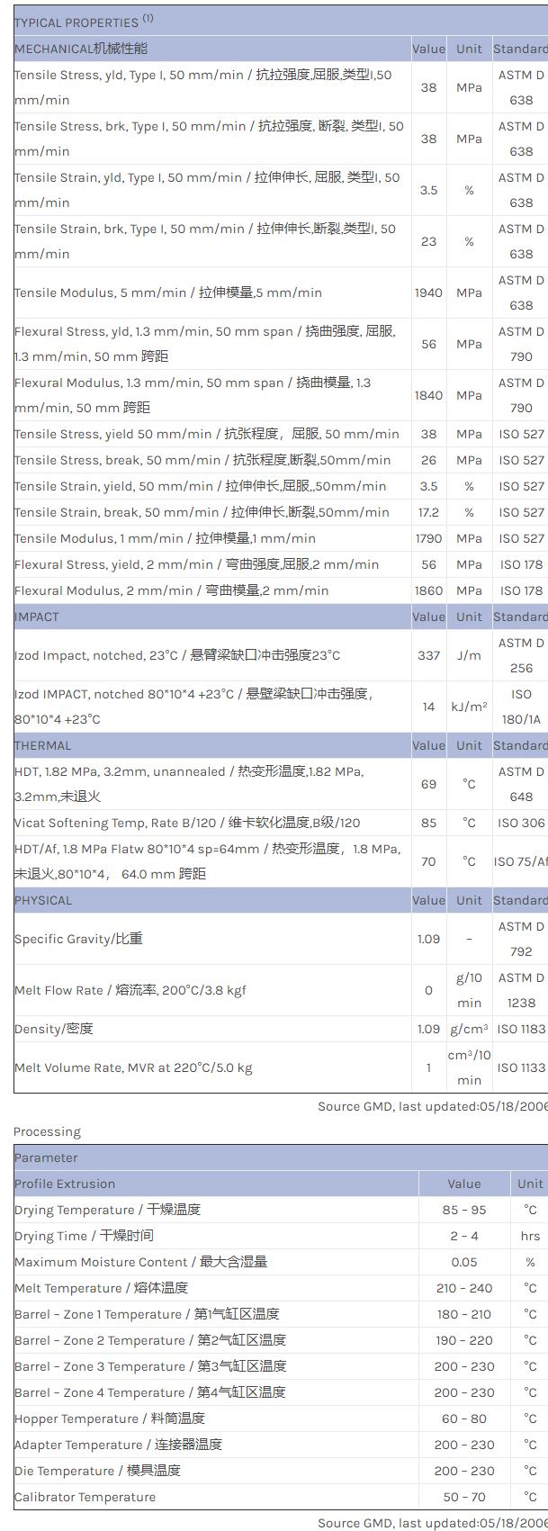 应用范围:产品描述Geloy ASA EXGY0044物性表ASA Copolymer. Profile/Sheet over PVC or ABS. Excellent weatherability, good flow/aesthetics and good IMPACT.