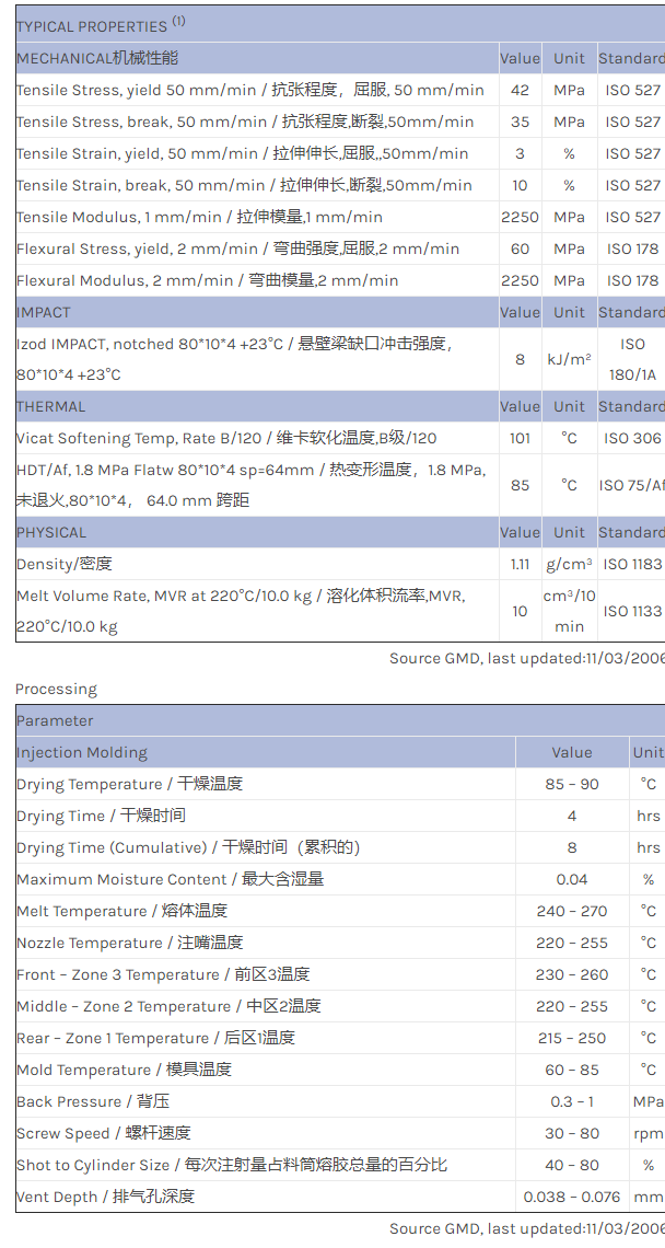 应用范围:产品描述Geloy ASA EXGY0048物性表Weatherable Geloy* XTW resin incorporating high heat, good flow and Visual effects (sparkle) with improved scratch and mar properties for various applications and markets. A c