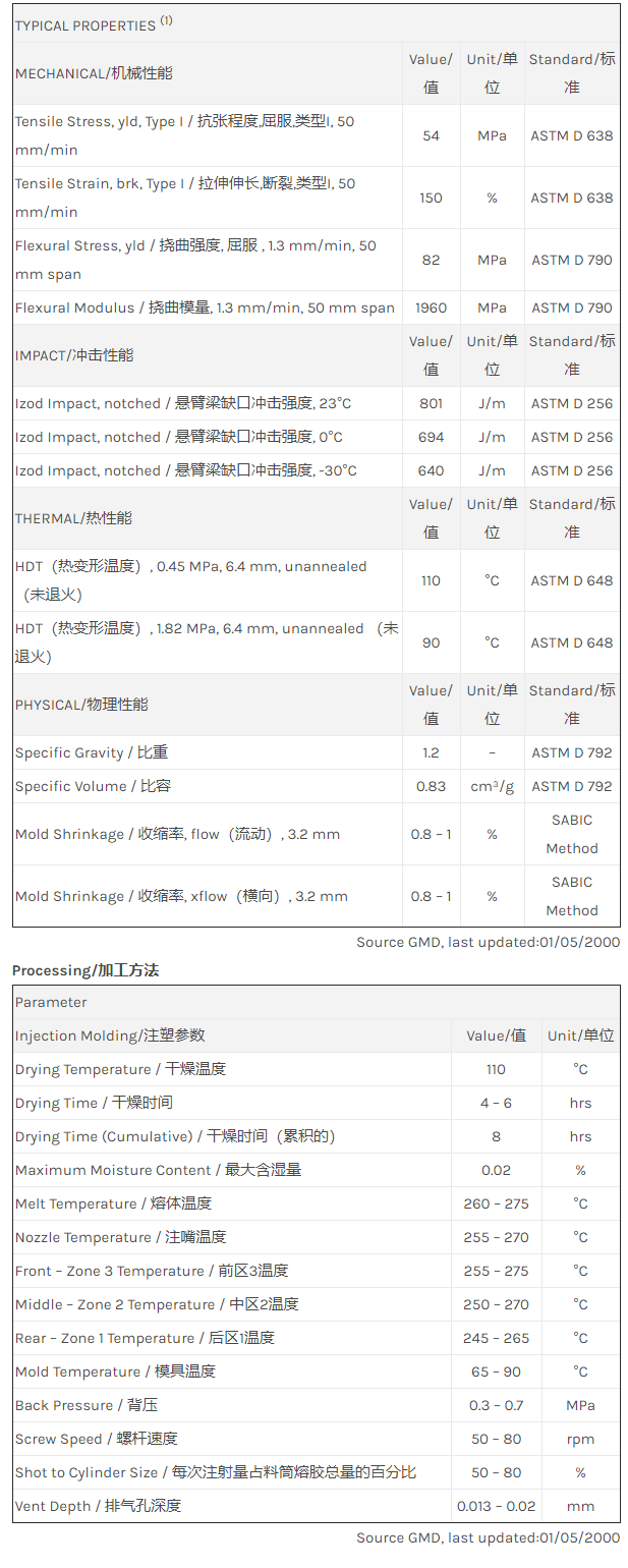应用范围: 产品描述 Xenoy PC/PBT/PET 1102物性表 “XENOY 1102是一种聚碳酸酯+聚丁烯对苯二甲酸酯(PC+PBT)合金化聚合物材料,加工方式为:注射成型。 XENOY 1102的主要特性有: 耐冲击 耐化学品 未增强 PC/聚酯。 对汽车燃料有优异的低温抗冲击性与耐化学剂性。” 相关颜色色号:1102-GY6E525、1102-BK1066、1102-7001