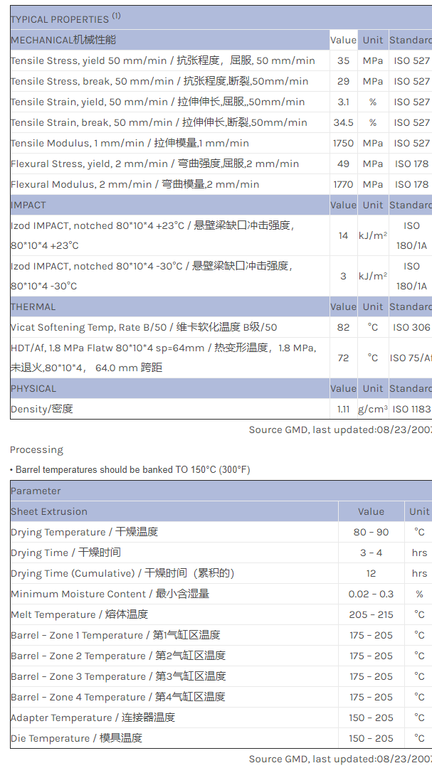 应用范围:产品描述Geloy ASA XTWE230I物性表This is a high IMPACT, lowest gloss grade for use as capstock in coextrusion applications