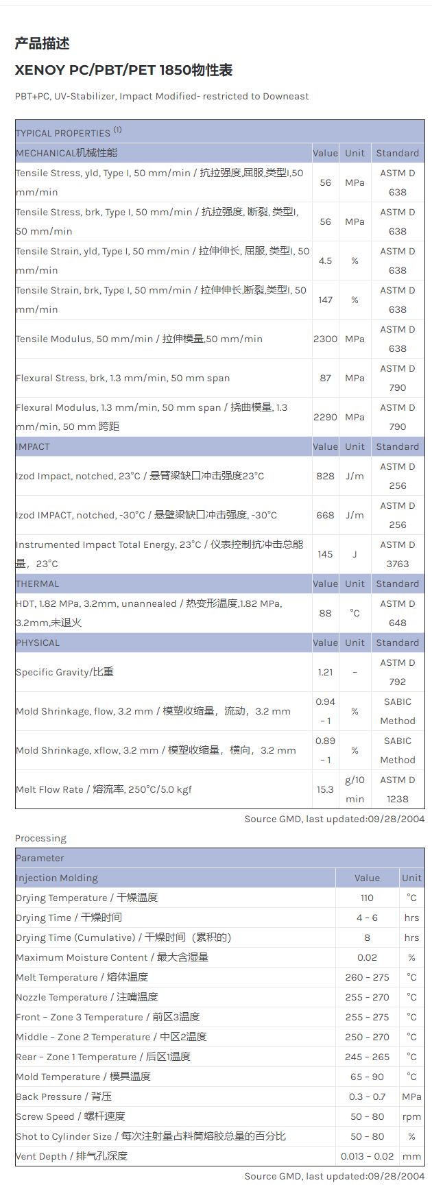 应用范围:产品描述XENOY PC/PBT/PET 1850物性表PBT+PC, UV-Stabilizer, Impact Modified- restricted to Downeast